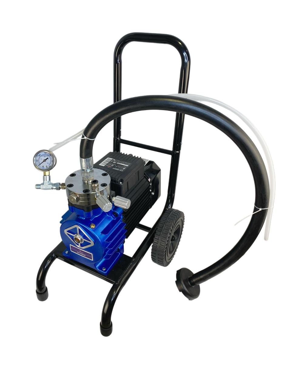 Под действием электрического мембранного насоса лакокрасочное покрытие подается через шланг на распылитель для краски. Преимущество безвоздушного электрического окрасочного аппарата: низкая цена, мобильность и легкость аппарата, простота конструкции и легкость в обслуживании.
