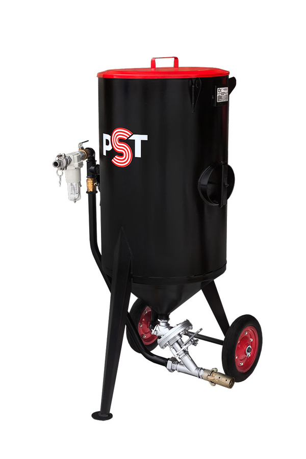 Резервуар пескоструйного аппарата, работающего под давлением, сварен из прочной стали с учетом всех требований безопасности.
