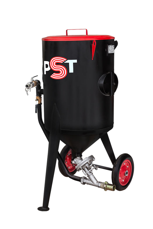 Резервуар пескоструйного аппарата, работающего под давлением, сварен из прочной стали с учетом всех требований безопасности.